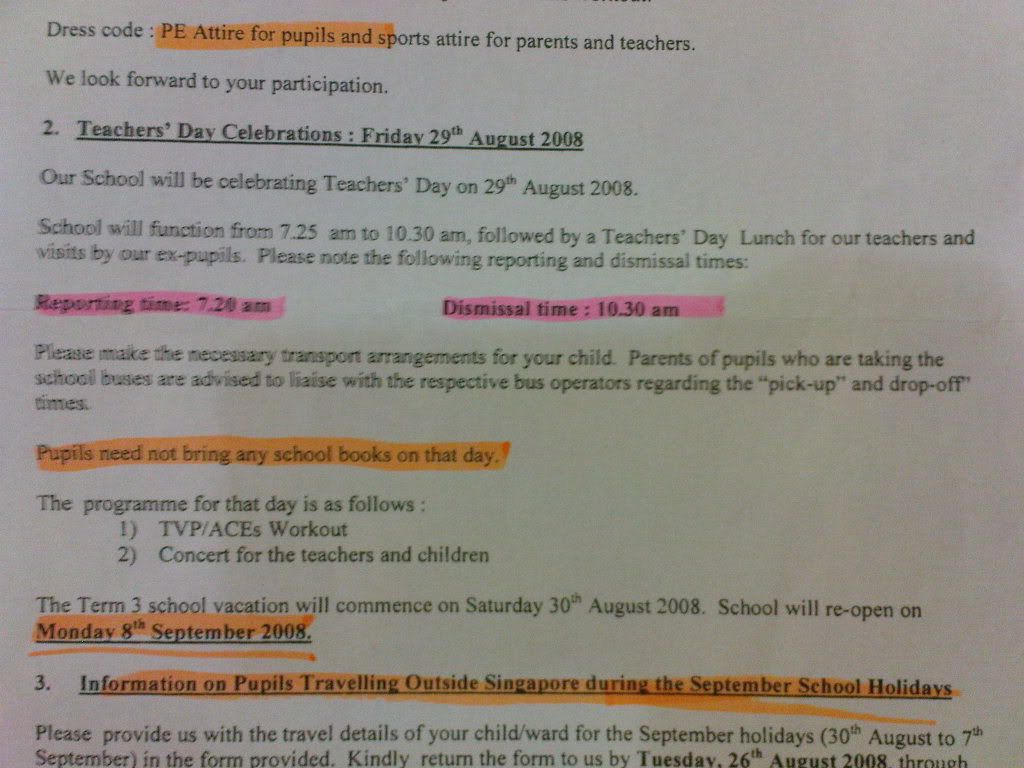 5:57 PM ![]() I know my circling skills is damn lan can . ![]() A closer look at it [: ---- In any case you all cannot see , i shall repeat it here . "2. Teachers' Day Celebrations : 29th August 2008 Our school will be celebrating Teachers' Day on 28th August 2008. School will function from 7.25 am to 10.30 am, followed by our Teachers' Day Lunch for our teachers and visits by our ex-pupils. Please note the following reprting ad dismissal times: Reporting time: 7.20 am Dismissal time: 10.30 am Please make the neccesary transport arrangements for your child. Parents of pupils who are taking the school buses are advised to liaise with the respective bus operators regarding the "pick-up" and "drop-off" times. Pupils need not bring any books on that day. The programme for that day is as follows : 1) TVPS/ACEs Workout 2) Concert for the teachers and children The Term 3 vacation will commence on Saturday 30th August 2008. School will re-open on Monday 8th September 2008." Sorry , i've written everything single thing in . Even those which are not important to us larh XD All just take note okayys [: Everything in this is copied from my blog XD Cheryl @ Lethlovebegin ♥